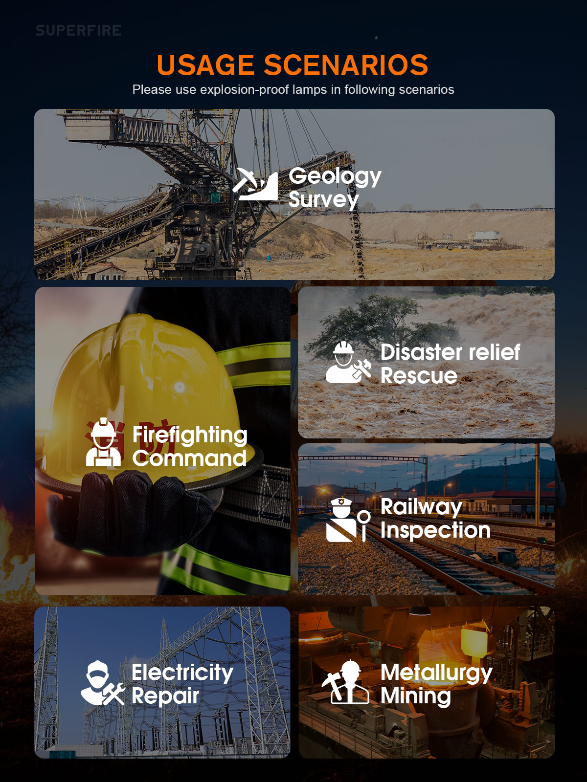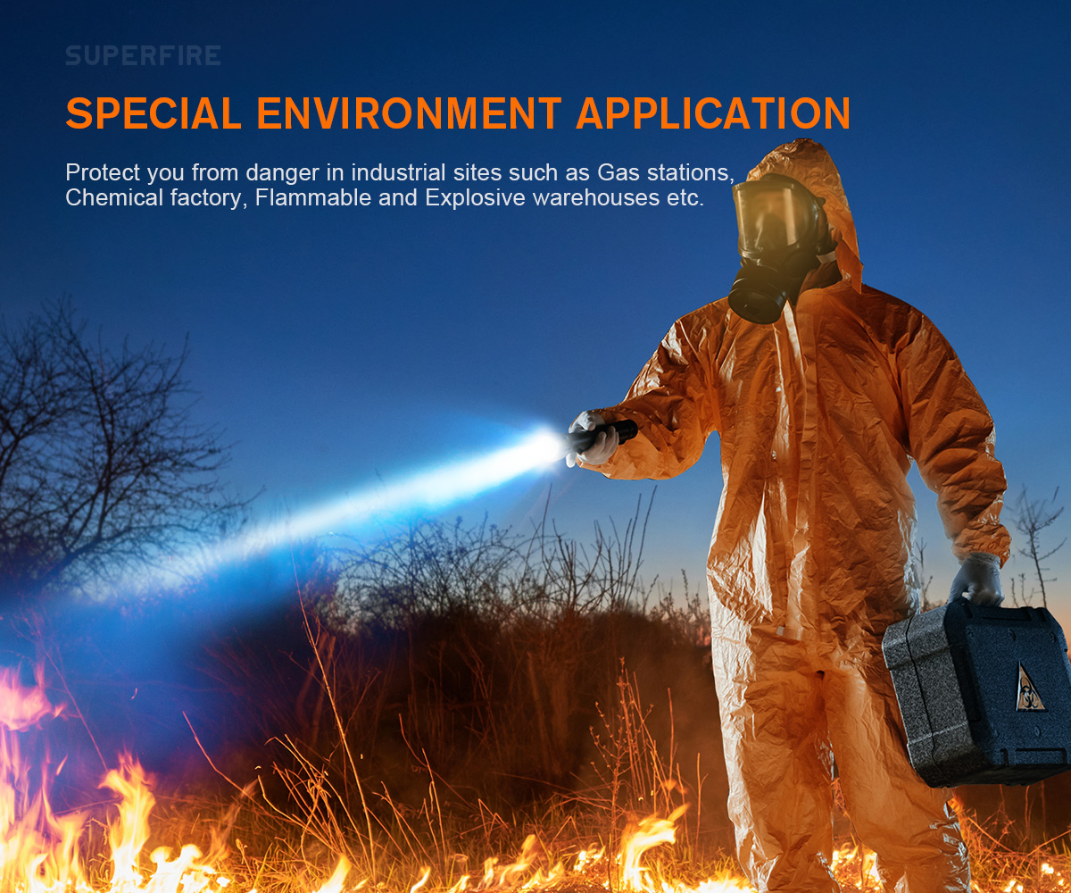 SUPERFIRE D6防爆LED懐中電灯は、厳格な安全基準を満たすように設計されており、EXおよびIEC防爆分類で認定されています。 ガスと空気の混合物があるゾーンB環境など、危険ゾーンに適した防炎 (ib) 設計を備えています。 T4定格では、その表面温度は135 ℃ 未満のままである。 懐中電灯は持ち運びに便利な斜めのストラップを誇り、用途の広い充電オプションを提供します。 内蔵の充電式保護は寿命を保証し、ダイヤモンドで設計されたグリップは滑りを防ぎます。 D6のハードキャップデザインは耐久性を高め、快適な革のスイッチボタンで補完されます。 高度なマイクロコントローラプログラミングにより、最高級のギフトボックスにパッケージ化された、最大8時間の長持ちする照明を提供します。